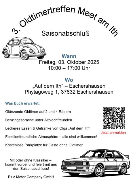 Was für ein großartiger Abschluss einer erfolgreichen Saison! Unser drittes „Meet am ith“ war wieder ein voller Erfolg. Bei bestem Spätsommerwetter kamen über 120 Oldtimer und zahlreiche Besucher zusammen, um gemeinsam einen unvergesslichen Tag zu erleben.